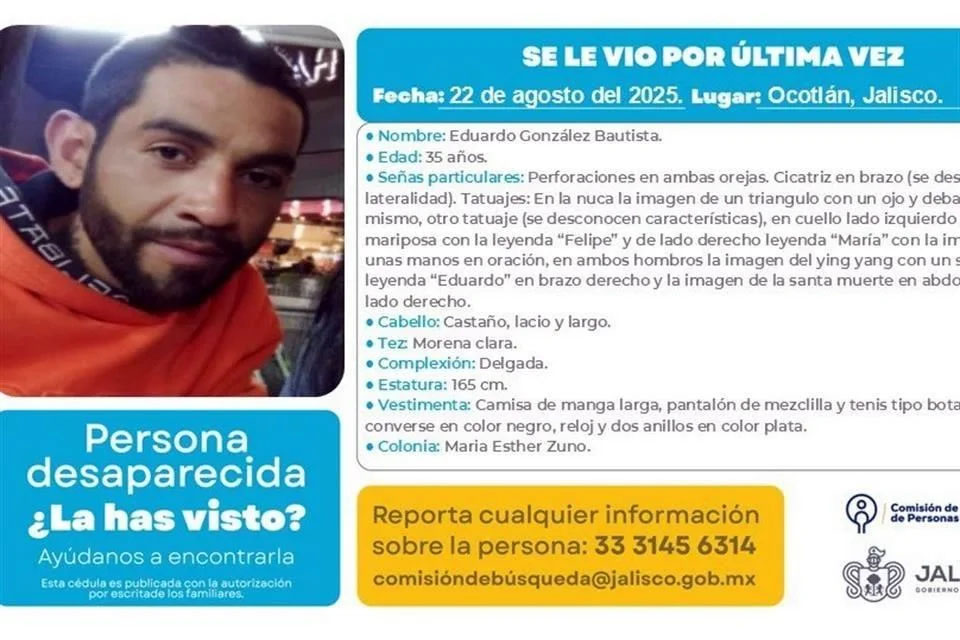 El rostro de Eduardo González Bautista de 35 años apareció primero en una ficha de búsqueda. Fue reportado como desaparecido el 22 de agosto en Ocotlán, y semanas después, el 11 de septiembre, su imagen circulaba en redes bajo el encabezado que tantas familias temen ver: “Ayúdanos a encontrarlo”.