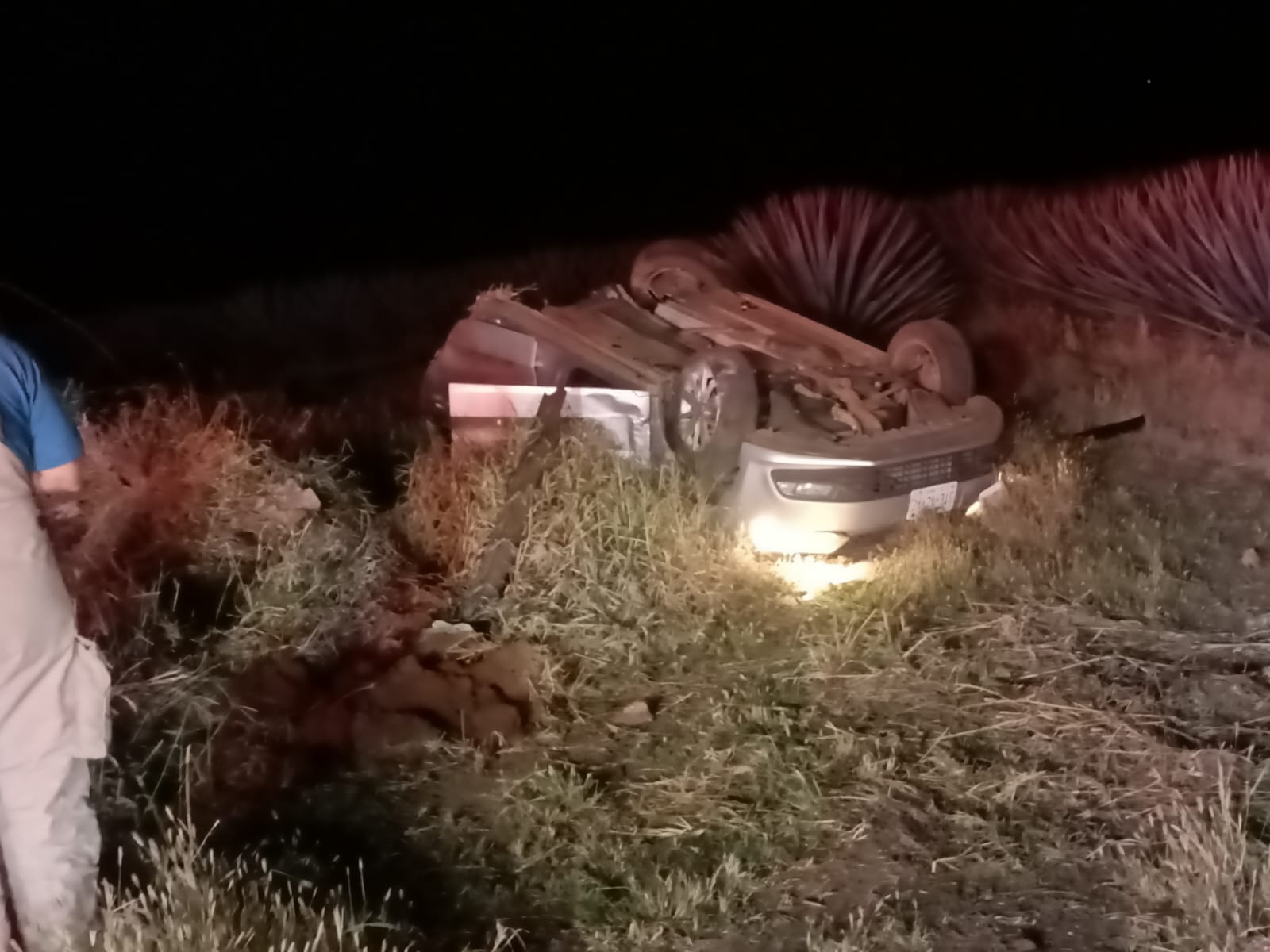Pasadas las 10:30 de la noche, los servicios de emergencia recibieron el reporte de un vehículo tipo sedán que había salido del camino y terminó sobre una plantación de agave.